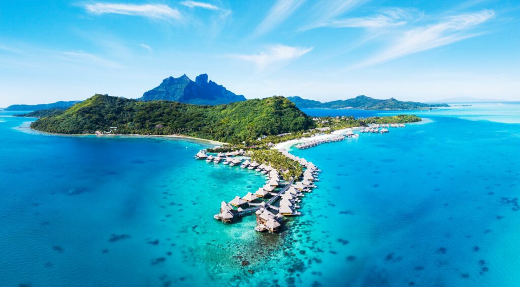 Ein erloschener Vulkan, ein Barriere-Riff, eine Lagune in allen erdenklichen Blautönen, von Kokospalmen gesäumte weiße Sandstrände. Pfahlbauten, in denen man die Nacht verbringen kann – so stellt man sich das Paradies vor. Bora Bora, 260 km nordwestlich von Papeete gelegen, gehört zu den Gesellschaftsinseln. Auf der Insel mit den bescheidenen Abmessungen (38 km2) leben lediglich 9600 Menschen. In den von einem Barriere-Riff geschützten Meerestiefen um Bora Bora tummelt sich eine außergewöhnliche Unterwasserfauna. Auf der Insel selbst kann man auf geführten Wanderungen die üppige tropische Fauna entdecken.