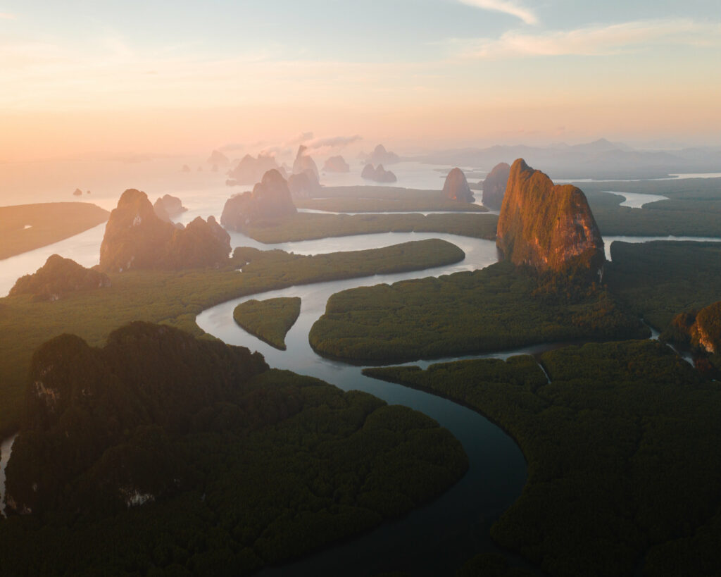 Die Bucht von Phang-nga, 90 km nördlich von Phuket gelegen, ist für seine zahlreichen dicht bewachsenen Kalknadeln bekannt. Das Fundament dieser gigantischen natürlichen Totempfähle wurde vom Meereswasser ausgewaschen, das beeindruckende natürliche Grotten schuf. Eine absolut einmalige Naturlandschaft. Die fantastische – und äußerst touristische – Felsnadel Khao Ta-Pu ist in der ganzen Welt als Drehort für den James-Bond-Film Der Mann mit dem Goldenen Colt bekannt.