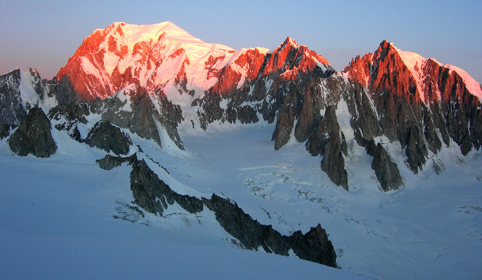 Auf relativ kleiner Fläche (400 KM²) erstreckt sich die Mont-Blanc-Gruppe über Frankreich, Italien und die Schweiz und lässt sich mit dem über Chamonix auftragenden Mont Blanc (4810 m) mit Fug und Recht als das Dach Europas bezeichnen.